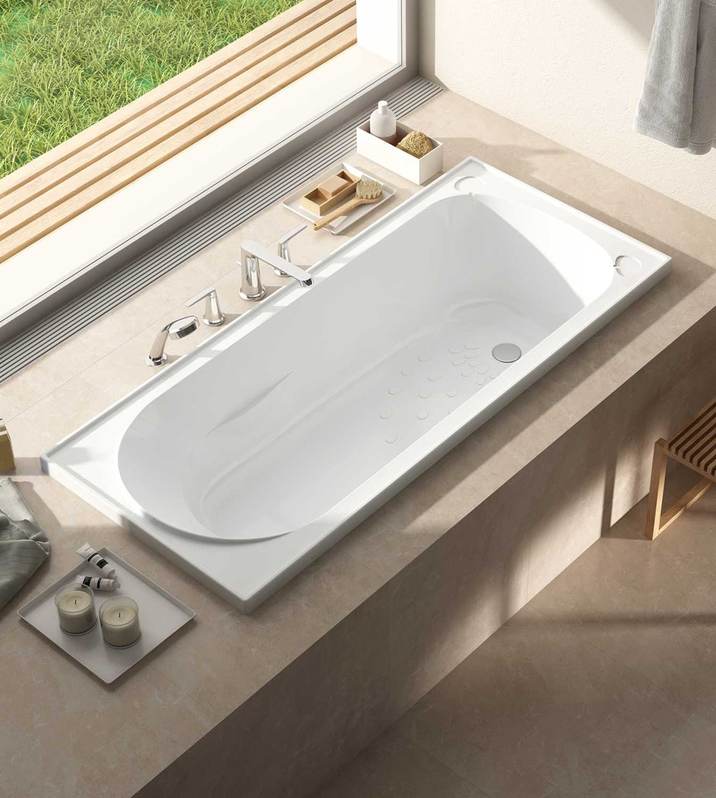 4 sided tile flange Arm rests Soap holders Suitable for inbuilt installation Self-supporting (mortar bed not required) Sanitary grade acrylic Anti-slip pattern surface Suitable for shower over bath 40mm waste not included